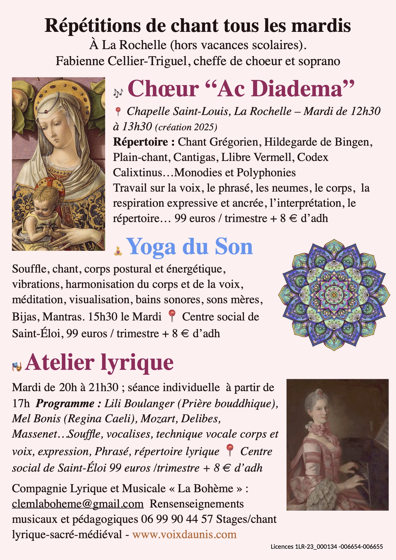 Toute l’année sur La Rochelle : le mardi pendant les périodes scolaires à La Chapelle St Louis à 12h30 choeur Ac Diadema (médiéval sacré, grégorien, Hildegarde de Bingen) , au centre social de St Eloi, Yoga du son à 15h30, séances individuelles de 17h à 20h et atelier lyrique de La Bohème (Technique vocale, Airs, Lieder, Polyphonies…) de 20h à 21h45 flyer